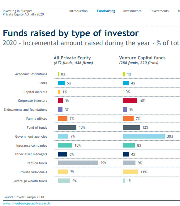 V roce 2020 činily objemy VC fundingu v Evropě 16 miliard € shromážděných celkem od 288 fondů. Jedná se o 7% pokles oproti roku 2019, který byl však rekordní (16,7 mld. €). Mezi země, které se mohou označovat za hlavní zdroj kapitálu již tradičně patřila Francie a region Beneluxu, které dohromady poskytly rekordních 5 miliard €.
